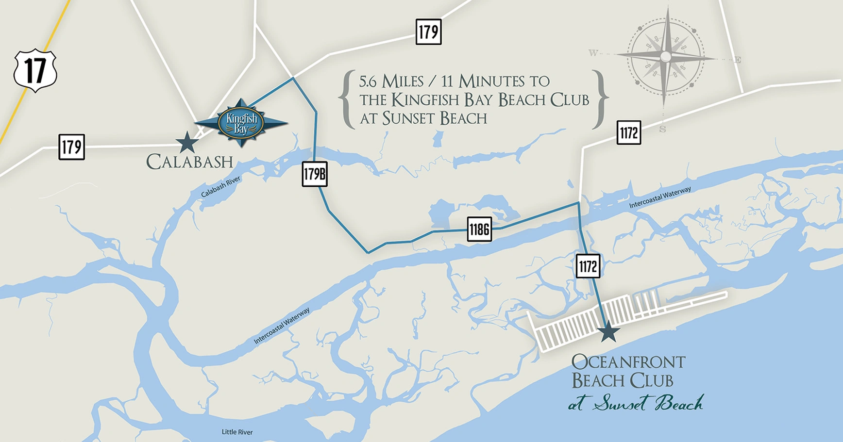 The Relaxed Living of Kingfish Bay includes your own little slice of paradise at the beach. The Oceanfront Clubhouse is available for residents to enjoy the sand, surf and sun of Sunset Beach, which is located only 5.6 miles or a 10-minute car ride from Kingfish Bay.