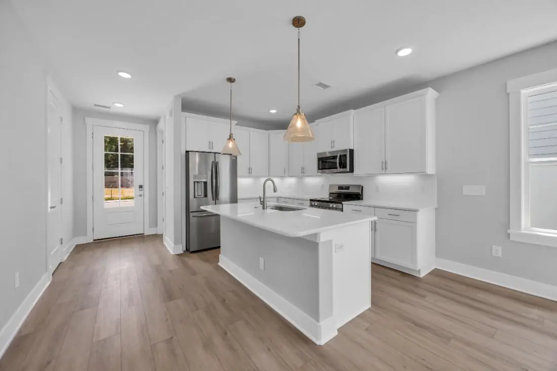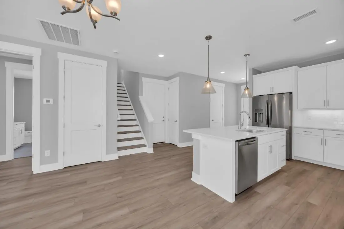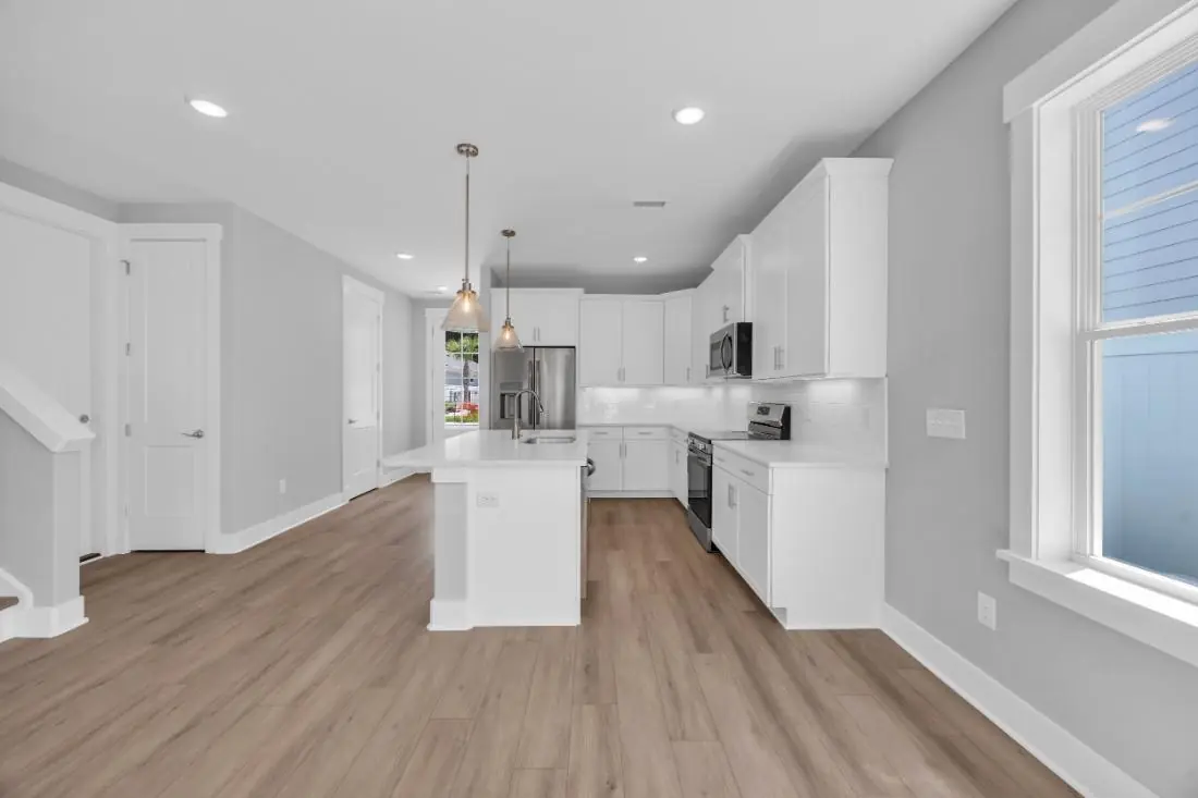 - Open main-level layout connecting the kitchen, dining, and living areas